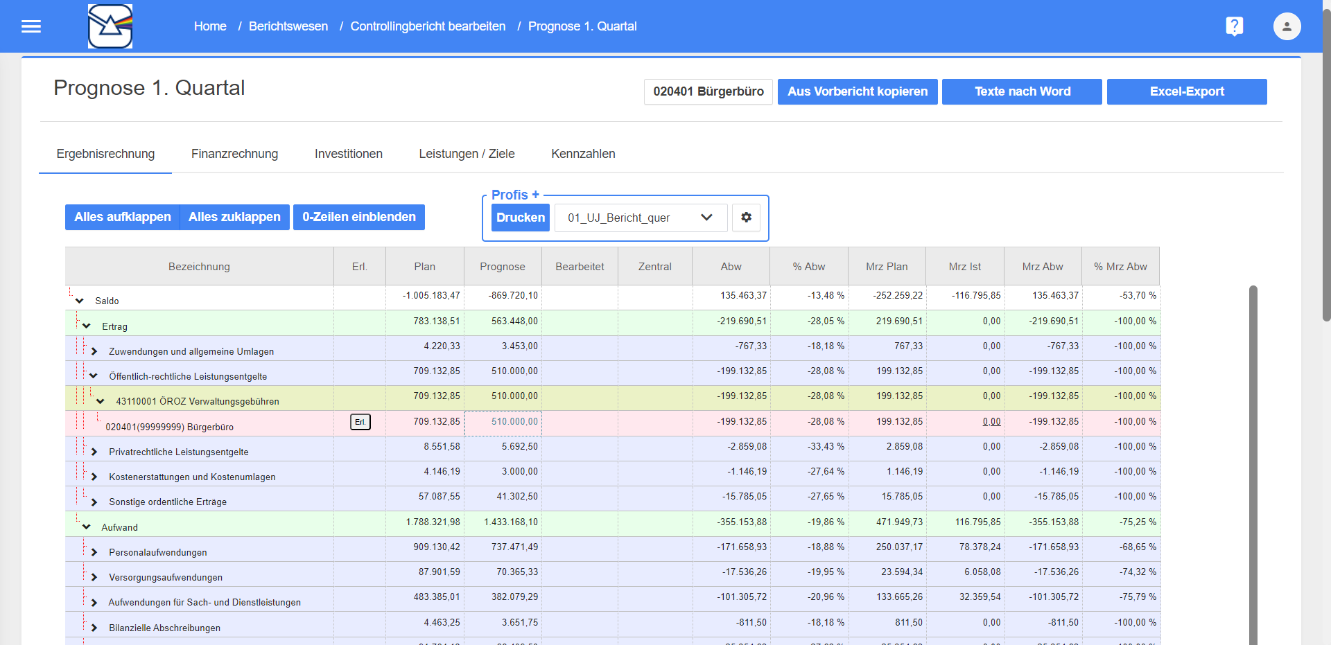 Berichtswesen ist in ProFIS-Net nicht nur der Druck eines qualitativ hochwertigen formatierten Berichts. Berichtswesen in ProFIS-Net ist ein Controlling-Prozess und dient zur Erstellung von Monats-, Quartals- und Jahresberichten. Aber auch jeder andere Zeitraum ist denkbar. So erstellen viele unserer Kunden den ersten Bericht zum 30. April eines Jahres. Die Philosophie des Controlling-Berichtswesens ist die Darstellung des unterjährigen Plan-Ist-Vergleiches, einer Jahresendprognose und entsprechenden Erläuterungen, um Ursache und Auswirkungen von Abweichungen zu beschreiben.